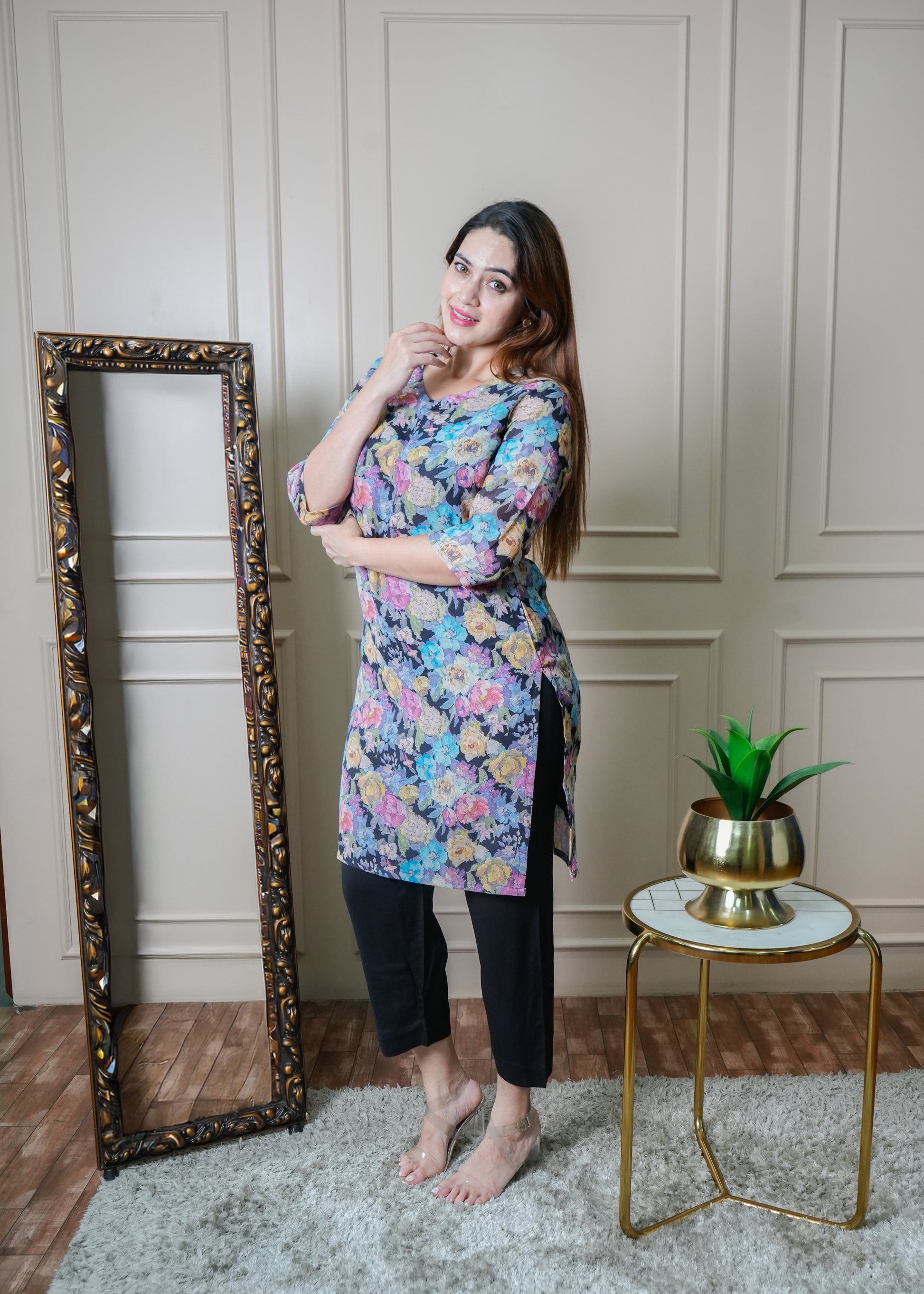Black with Multicolour Floral Vintage Linen Kurti Pant Set